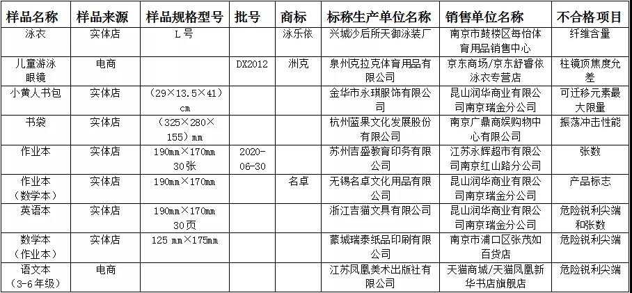 抽查泳裝20批次,其中實體店15批次,電商5批次,合格19批次,不合格1批次,合格率95%,主要不合格項目為纖維含量;抽查泳鏡20批次,其中實體店15批次,電商5批次,合格19批次,不合格1批次,合格率95%,主要不合格項目為柱鏡頂焦度允差;抽查護(hù)眼燈20批次,其中實體店12批次,電商8批次,合格20批次,合格率100%;抽查書包20批次,其中實體店11批次,電商9批次,合格18批次,不合格2批次,合格率90%,主要不合格項目為可遷移元素最大限量和振蕩沖擊性能;抽查作業(yè)本20批次,其中生產(chǎn)企業(yè)4批次,實體店13批次,電商3批次,合格15批次,不合格5批次,合格率75%,主要不合格項目為產(chǎn)品標(biāo)志、張數(shù)、危險銳利尖端。