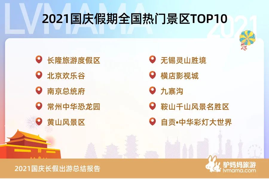《報(bào)告》顯示,IP樂園、山水名勝、人文景區(qū)等繼續(xù)領(lǐng)跑國慶出游季。其中,長隆旅游度假區(qū)、北京歡樂谷、南京總統(tǒng)府、常州中華恐龍園、黃山風(fēng)景區(qū)、無錫靈山勝境、橫店影視城、九寨溝、鞍山千山風(fēng)景名勝區(qū)、自貢•中華彩燈大世界位居全國十大熱門景區(qū)。