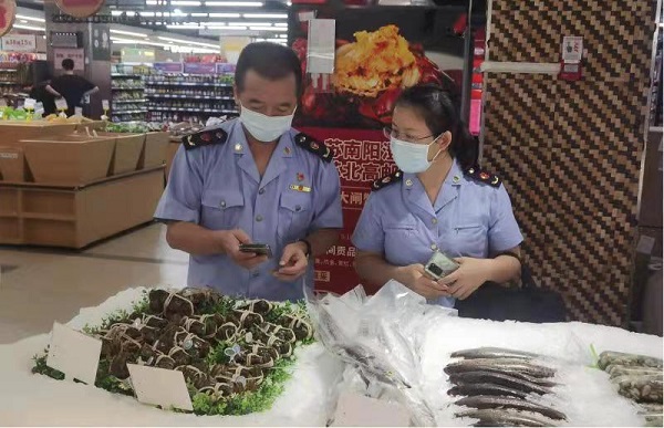 工作人員檢查商家“蟹卡”銷售情況。資料圖片