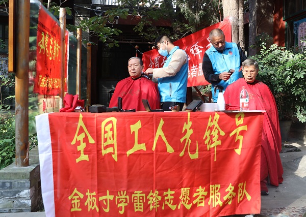 北京金板寸文化發(fā)展中心志愿者服務隊為居民開展義務理發(fā)服務。