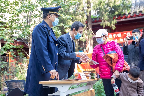 東城區(qū)市場監(jiān)管局工作人員向居民宣講食品安全知識。