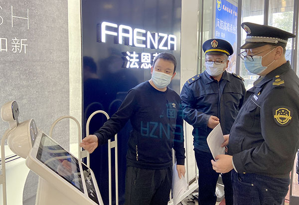 執(zhí)法人員對(duì)商戶測(cè)溫設(shè)備準(zhǔn)確性進(jìn)行檢查。