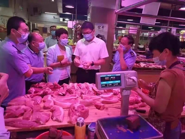 市場監(jiān)管執(zhí)法人員對肉攤進行檢查。資料圖片