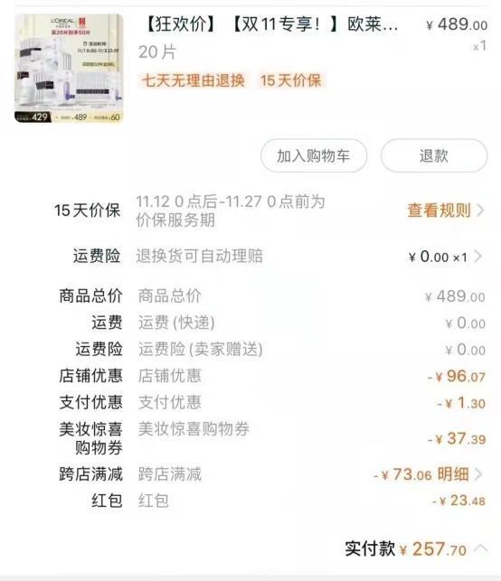 10月底,李佳琦、薇婭等多位頭部主播在直播間里帶貨了一款歐萊雅安瓶面膜,歐萊雅官方宣稱“全年最大力度”,50片面膜售價(jià)為429元,隨后慘遭“打臉”。不少消費(fèi)者隨后在11月初發(fā)現(xiàn),能以接近半價(jià)的價(jià)格在歐萊雅品牌方的直播間購入同款50片面膜。