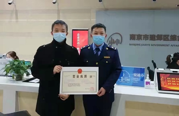 建鄴區(qū)市場監(jiān)管局發(fā)出南京首張“跨省通辦”企業(yè)全程電子化登記營業(yè)執(zhí)照。資料圖片