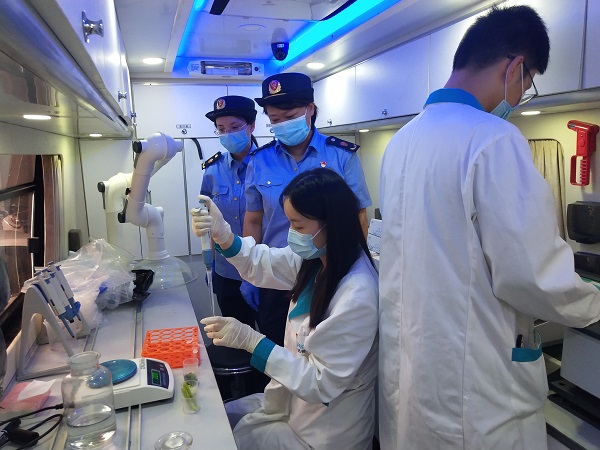 由食品科、食藥所黨員組成的流動食品安全檢測突擊隊正在快檢車上對蔬菜進(jìn)行快檢。資料圖片