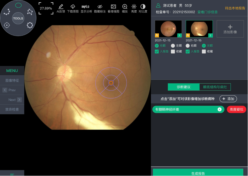 據(jù)介紹,眼科多病種輔助診斷AI是通過(guò)人工智能技術(shù),對(duì)眼部病變進(jìn)行輔助診斷的SaMD (Software as Medical Device)系統(tǒng)。這一系統(tǒng)通過(guò)先進(jìn)的醫(yī)療人工智能算法、標(biāo)準(zhǔn)化的閱片工具和完整的過(guò)程質(zhì)控,對(duì)眼底照片的特征和病灶尺寸、病變程度進(jìn)行訓(xùn)練和學(xué)習(xí)。AI模型基于數(shù)十位眼科專(zhuān)家對(duì)數(shù)萬(wàn)張眼底照片的判讀、圈點(diǎn)、標(biāo)注,學(xué)習(xí)專(zhuān)家在眼部疾病領(lǐng)域?qū)I(yè)的經(jīng)驗(yàn)和豐富的知識(shí),對(duì)眼部疾病進(jìn)行自動(dòng)識(shí)別,進(jìn)一步對(duì)多種眼部病變的診斷提供輔助依據(jù)。