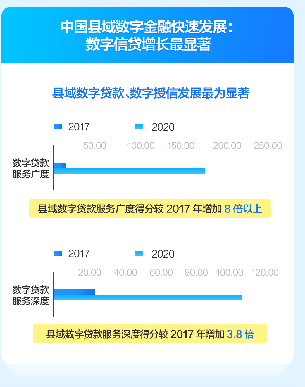 《報告》稱,2017年至2020年,全國縣域數(shù)字普惠金融發(fā)展總指數(shù)得分的中位數(shù)快速上升。其中,近4年,在支付、信貸、授信、理財、保險等五類縣域數(shù)字普惠金融服務中,數(shù)字貸款和數(shù)字授信作為基礎的金融服務類型,發(fā)展較快,增長最為顯著。