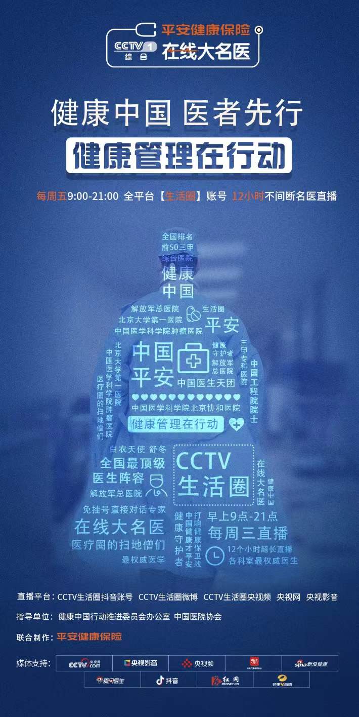 為全方位全周期維護(hù)和保障人民健康,提升國民健康素養(yǎng),平安健康保險(xiǎn)聯(lián)手CCTV1《生活圈》節(jié)目組聚集“2021年度中國醫(yī)院排行榜”(復(fù)旦大學(xué)醫(yī)院管理研究所發(fā)布)全國排名前50的三甲綜合醫(yī)院、三甲??漆t(yī)院(含中醫(yī)院),匯聚北京大學(xué)人民醫(yī)院、中國人民解放軍總醫(yī)院、首都醫(yī)科大學(xué)宣武醫(yī)院等權(quán)威醫(yī)院和頂級(jí)醫(yī)療資源,組織體量大、覆蓋廣的健康網(wǎng)絡(luò)直播。