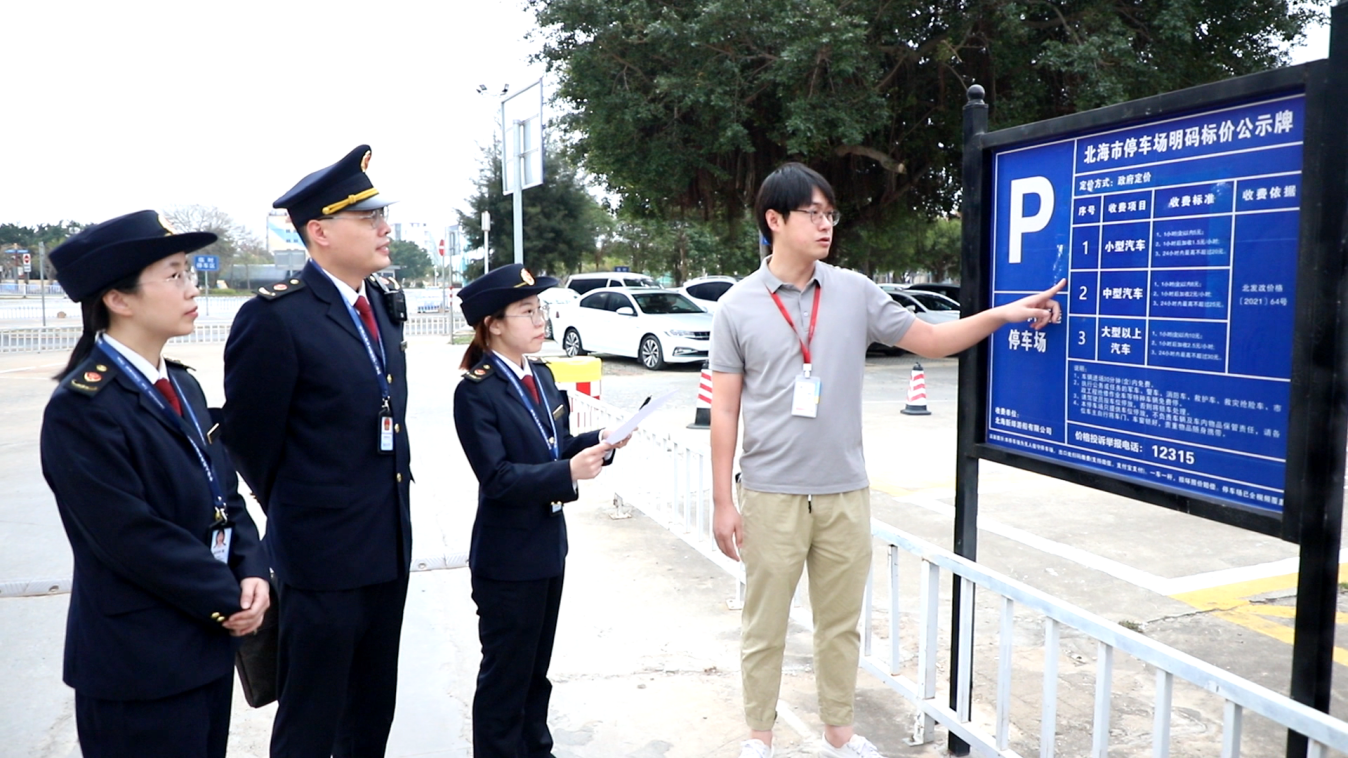 在北海國(guó)際客運(yùn)碼頭停車場(chǎng),北海市場(chǎng)監(jiān)管局執(zhí)法人員正在現(xiàn)場(chǎng)查看明碼標(biāo)價(jià)公示牌和收費(fèi)系統(tǒng),檢查該停車場(chǎng)是否執(zhí)行政府定價(jià),是否按規(guī)定明碼標(biāo)價(jià)。該停車場(chǎng)的負(fù)責(zé)人說:“市場(chǎng)監(jiān)管局經(jīng)常來幫助我們規(guī)范收費(fèi)服務(wù),現(xiàn)在我們停車場(chǎng)再?zèng)]有收到客人關(guān)于停車收費(fèi)的投訴了。”