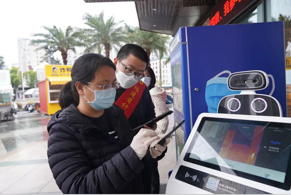 技術服務隊對測溫機器人進行檢測。資料圖片