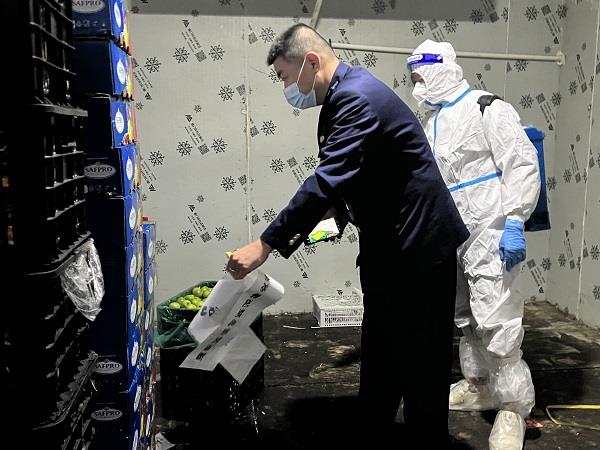 執(zhí)法人員對(duì)涉核酸檢測(cè)陽(yáng)性的進(jìn)口水果進(jìn)行封存處置。資料圖片