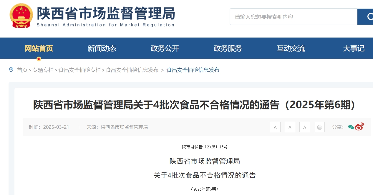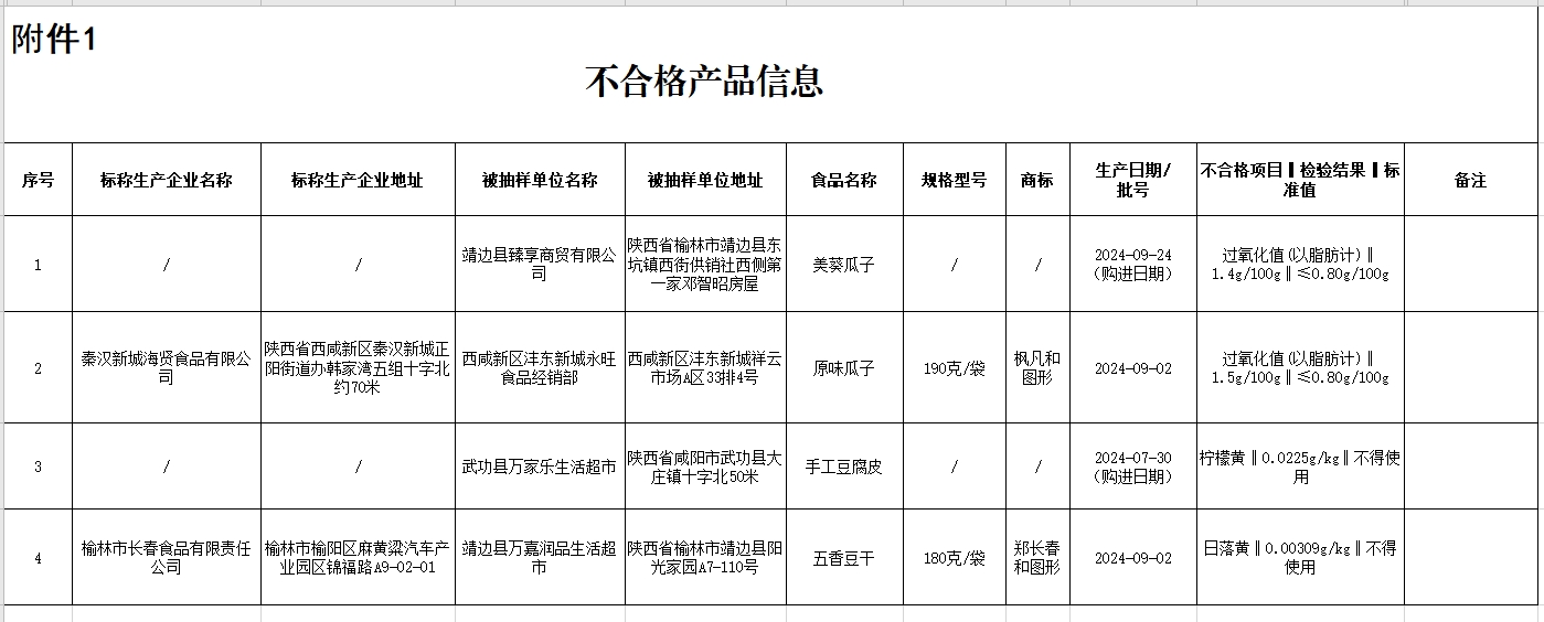 近期,陜西省市場(chǎng)監(jiān)督管理局組織的食品安全監(jiān)督抽檢中, 檢出4批次樣品不合格。產(chǎn)品抽檢結(jié)果可查詢https://spcjsac.gsxt.gov.cn/。