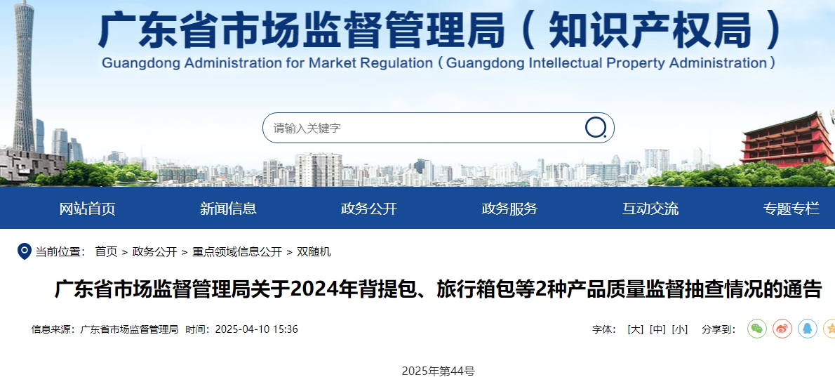 根據(jù)《中華人民共和國(guó)產(chǎn)品質(zhì)量法》《產(chǎn)品質(zhì)量監(jiān)督抽查管理暫行辦法》《廣東省產(chǎn)品質(zhì)量監(jiān)督條例》等相關(guān)規(guī)定,2024年,省市場(chǎng)監(jiān)管局組織開(kāi)展了背提包、旅行箱包等2種產(chǎn)品質(zhì)量監(jiān)督抽查?,F(xiàn)將抽查情況通告如下。