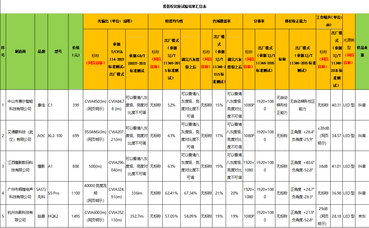 本次比較試驗委托中國家用電器研究院(北京)檢測認(rèn)證有限公司進(jìn)行檢測。按照相關(guān)標(biāo)準(zhǔn),對投影儀樣品的光輸出、照度均勻性、色域覆蓋率、顯示分辨率、自動梯形校正精度及工作噪聲項目進(jìn)行測試。