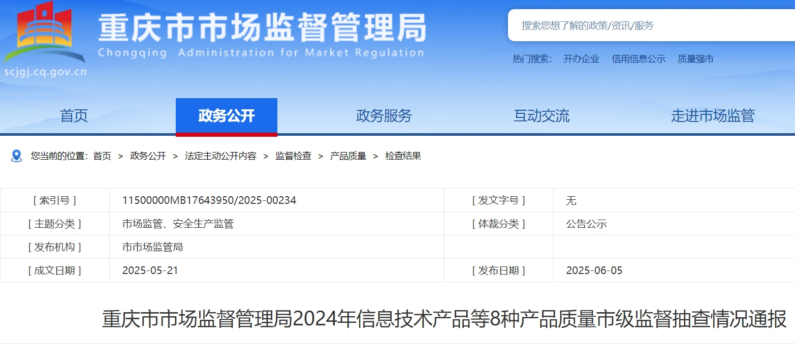 2024年,重慶市市場(chǎng)監(jiān)督管理局組織信息技術(shù)產(chǎn)品等8種產(chǎn)品質(zhì)量監(jiān)督抽查?,F(xiàn)將抽查情況通報(bào)如下: