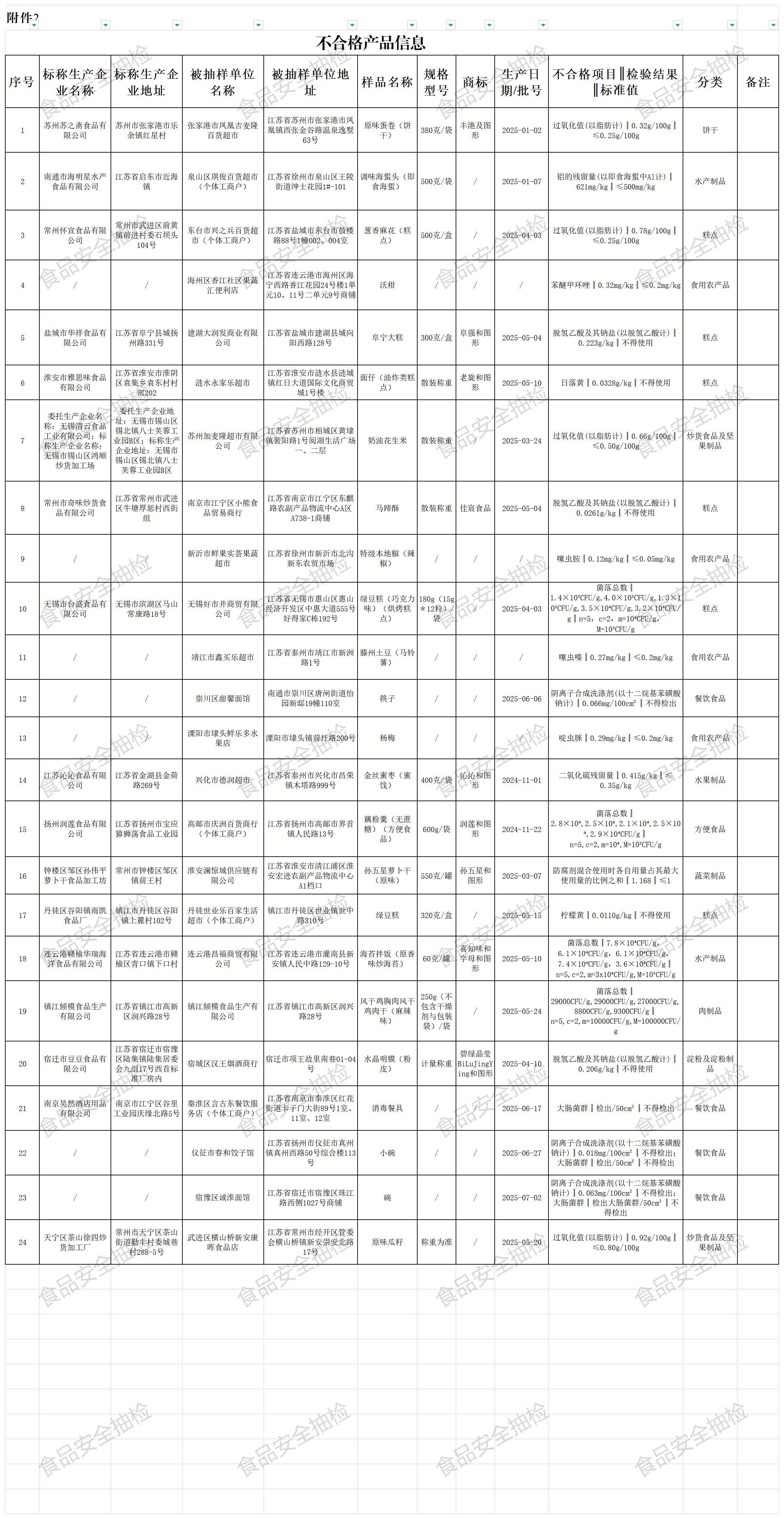 近期,江蘇省市場監(jiān)督管理局組織食品安全抽檢,抽取糕點、食用農(nóng)產(chǎn)品、炒貨食品及堅果制品、肉制品、糧食加工品、餐飲食品、飲料、蔬菜制品、淀粉及淀粉制品、水產(chǎn)制品、方便食品、水果制品及餅干等13大類食品1577批次樣品,檢出其中糕點、餐飲食品、食用農(nóng)產(chǎn)品、炒貨食品及堅果制品、水產(chǎn)制品、餅干、淀粉及淀粉制品、方便食品、肉制品、蔬菜制品及水果制品等11大類食品24批次樣品不合格,詳細信息見附表。
