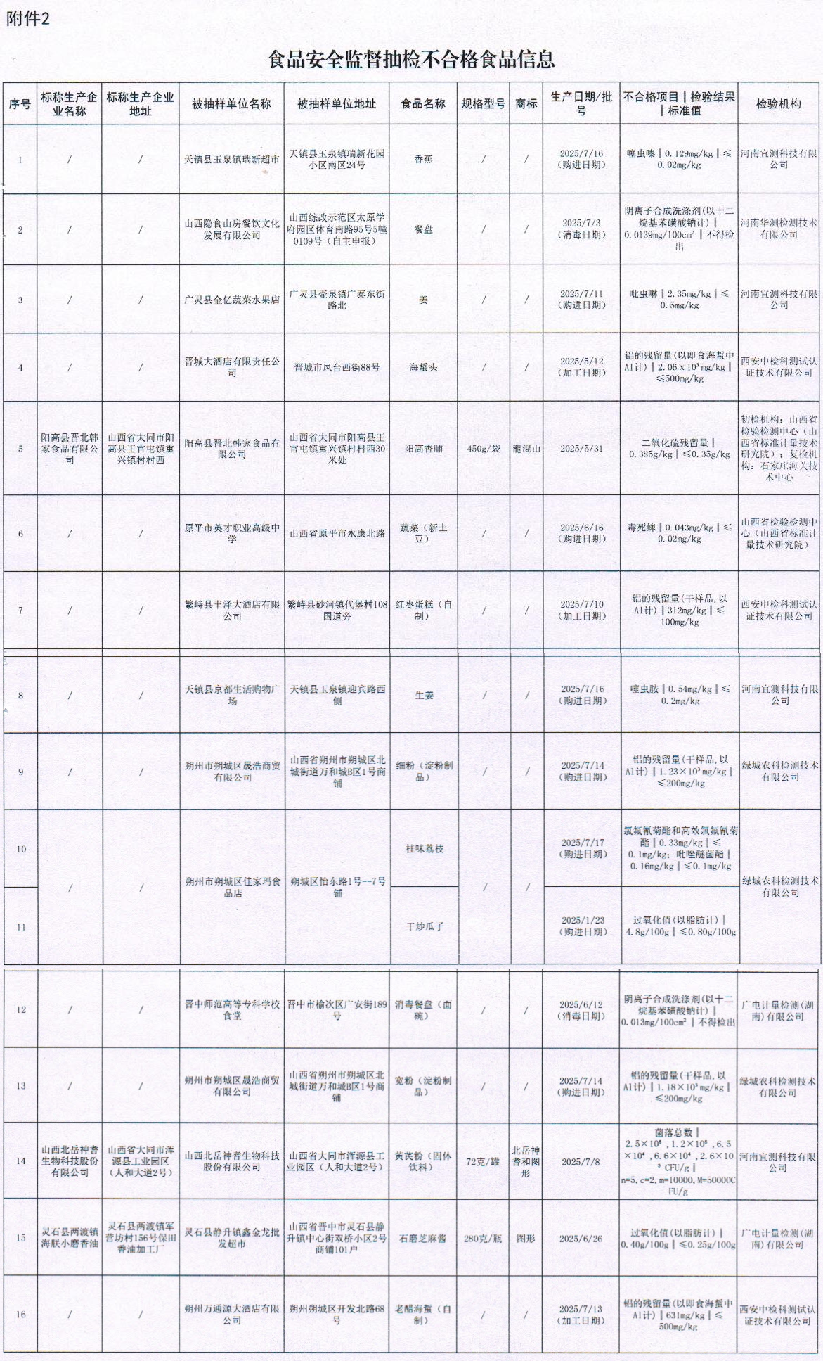 根據(jù)《中華人民共和國食品安全法》等法律法規(guī)要求及本省2025年度食品安全監(jiān)督抽檢工作實(shí)施方案和抽檢細(xì)則,山西省市場監(jiān)督管理局組織抽檢餐飲食品、豆制品、糕點(diǎn)、罐頭、酒類、糧食加工品、肉制品、食用農(nóng)產(chǎn)品、方便食品、薯類和膨化食品、水果制品、調(diào)味品、速凍食品、水產(chǎn)制品、蔬菜制品、乳制品、飲料、糖果制品、保健食品、冷凍飲品、炒貨食品及堅(jiān)果制品、淀粉及淀粉制品和食用油、油脂及其制品等23大類,共692批次。依據(jù)食品安全標(biāo)準(zhǔn)及國家有關(guān)規(guī)定進(jìn)行檢驗(yàn)和判定,合格676批次,不合格16批次(抽檢信息詳見附件)。