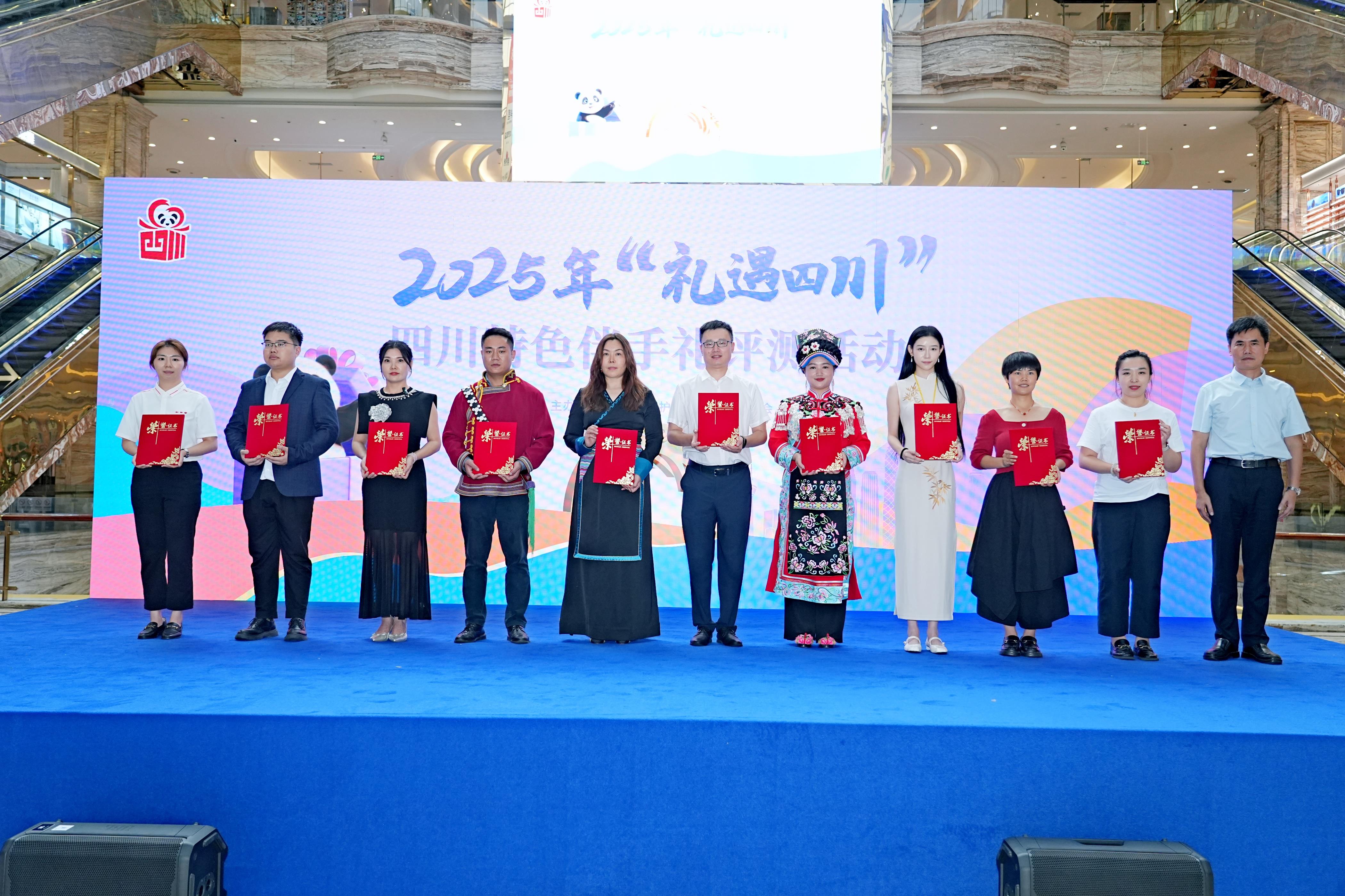 經(jīng)過激烈角逐,50款產(chǎn)品憑借顯著地域特色和豐富文化內(nèi)涵脫穎而出,獲評(píng)2025年“四川特色伴手禮”稱號(hào)。四川省消委會(huì)秘書長閆光耀等負(fù)責(zé)人現(xiàn)場(chǎng)為獲勝企業(yè)頒發(fā)了證書。