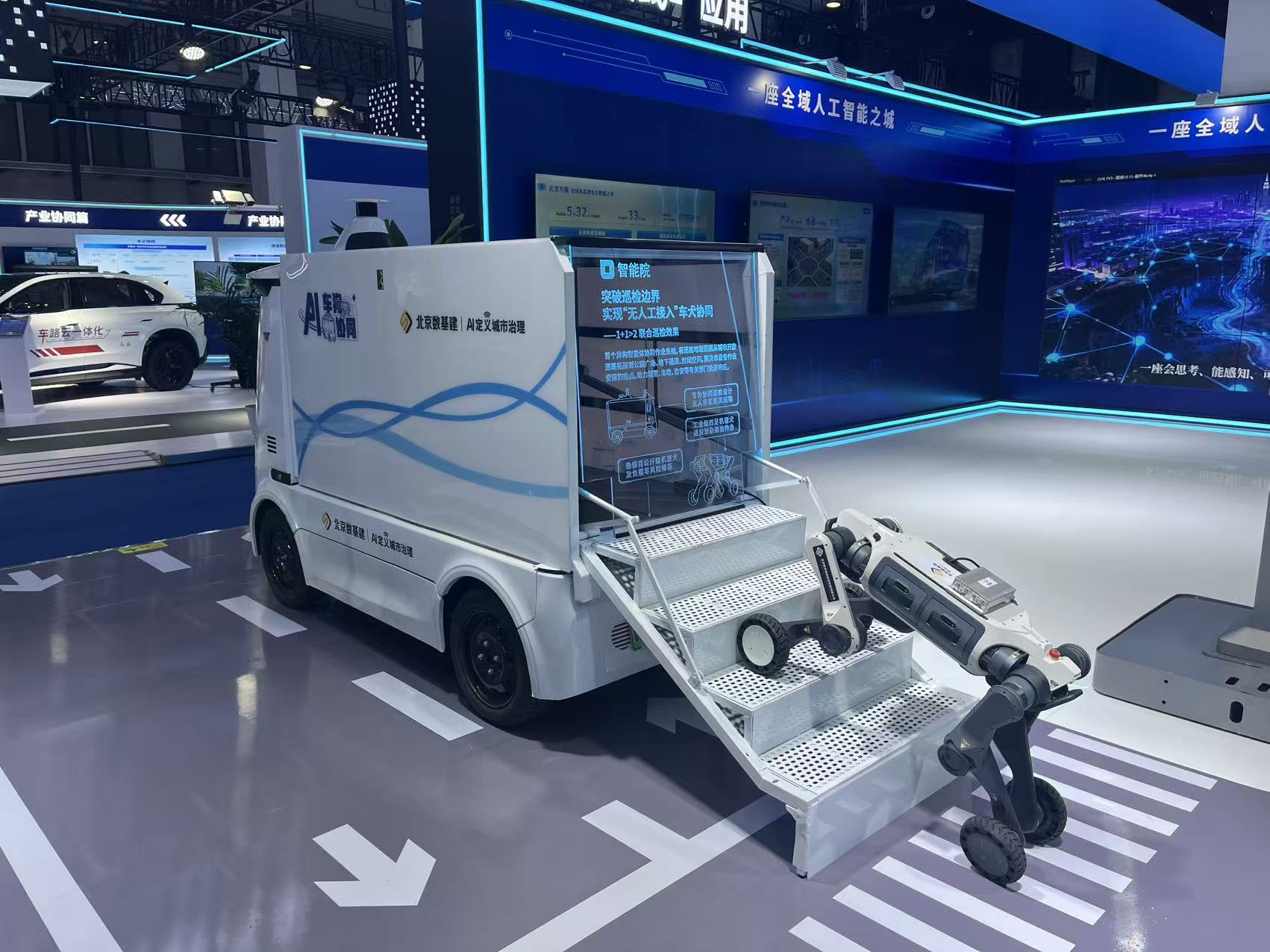 記者在技術(shù)成果展區(qū)采訪時(shí)注意到,一輛造型獨(dú)特的車狗協(xié)同巡檢車頗為引人注意。據(jù)悉,該車輛為業(yè)內(nèi)首個(gè)異構(gòu)智能體協(xié)同作業(yè)系統(tǒng),在一輛具備自動(dòng)駕駛能力的無(wú)人巡檢車輛內(nèi)額外配備了一只可實(shí)現(xiàn)工業(yè)級(jí)4足機(jī)器犬,將巡檢地理范圍從城市開(kāi)放道路擴(kuò)展到公園廣場(chǎng)、地下通道、封閉空間等,解決單設(shè)備作業(yè)受限的問(wèn)題,助力城管、市政、治安等有關(guān)部門(mén)快速響應(yīng)。