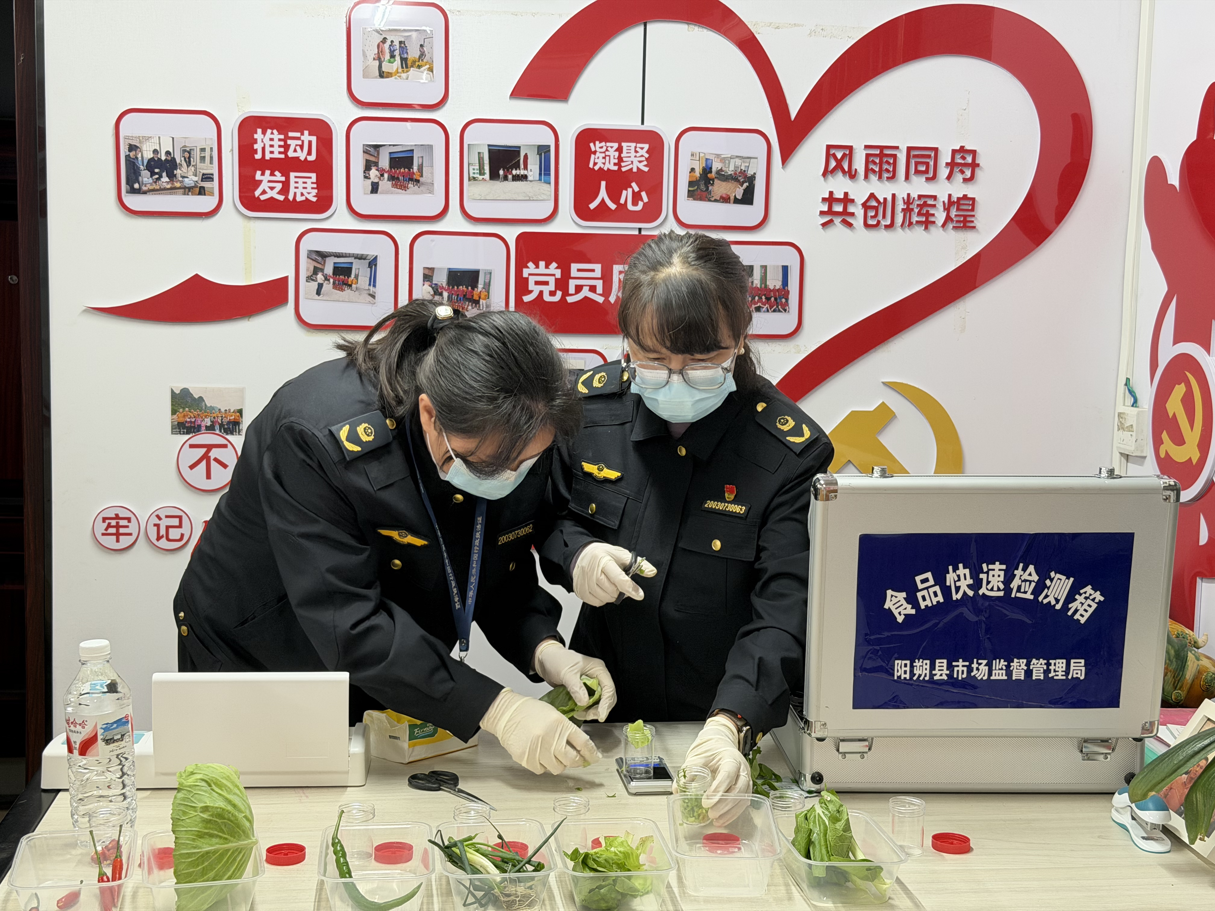 執(zhí)法人員對(duì)供應(yīng)商的食材進(jìn)行快檢。陽(yáng)朔縣市場(chǎng)監(jiān)管局供圖