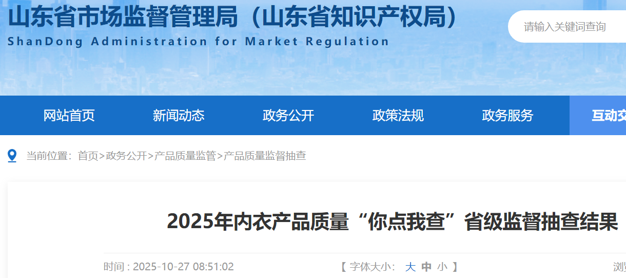 2025年第1批產品質量省級監(jiān)督抽查共抽查內衣產品42批次,其中,銷售環(huán)節(jié)32批次,網售環(huán)節(jié)10批次。