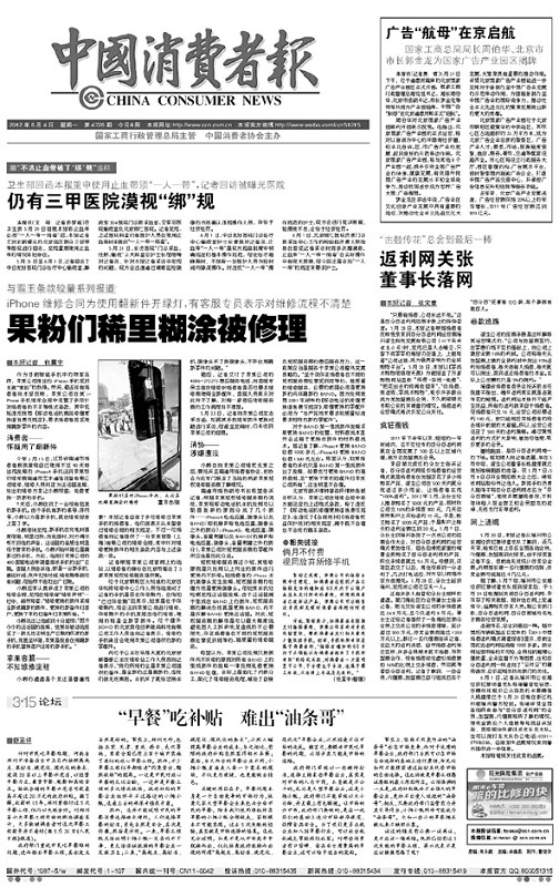 2012年5月,《中國消費者報》記者獲得線索——蘋果公司的維修合同上規(guī)定:“維修更換的部件采用全新或翻新的部件,更換的新備件歸客戶,更換下來的舊備件歸蘋果所有?!倍凑瘴覈?001年頒布的《移動電話機修理更換退貨責任規(guī)定》,修理更換的零配件必須為“與產品技術要求和質量標準要求相符的新的零配件”。于是,《中國消費者報》記者在進行調查核實后,于2012年6月4日刊發(fā)《果粉們稀里糊涂被修理》,報道了蘋果維修合同存在“霸王條款”的問題。