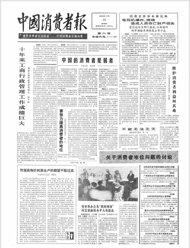 同年3月16日,《中國(guó)消費(fèi)者報(bào)》刊發(fā)《中國(guó)的消費(fèi)者是弱者》一文,正式開(kāi)啟了一場(chǎng)歷時(shí)半年多的關(guān)于消費(fèi)者地位問(wèn)題大討論。當(dāng)時(shí)我國(guó)正處于計(jì)劃經(jīng)濟(jì)向市場(chǎng)經(jīng)濟(jì)轉(zhuǎn)型初期,商品經(jīng)濟(jì)尚不發(fā)達(dá),消費(fèi)者地位問(wèn)題尚未引起足夠重視。《中國(guó)消費(fèi)者報(bào)》首次將這一議題推向公眾視野,立即引發(fā)經(jīng)濟(jì)界、理論界的廣泛關(guān)注。