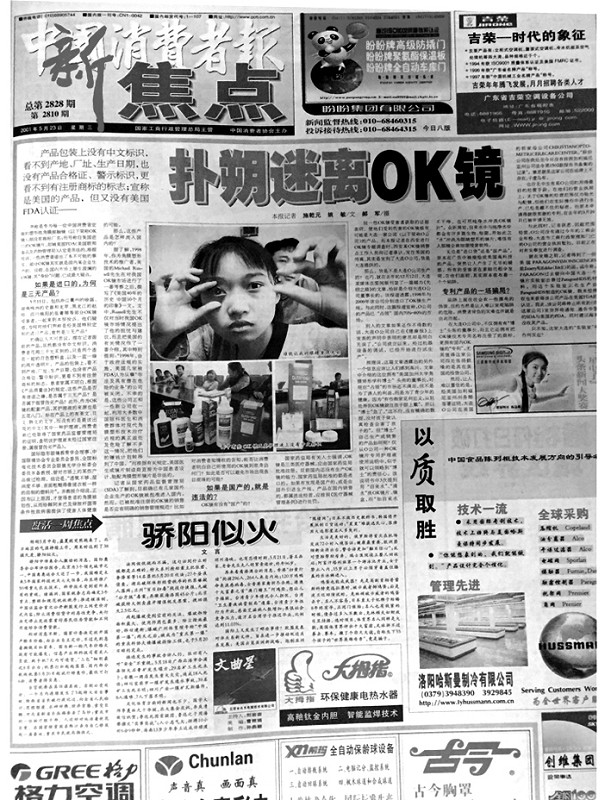 2001年5月23日,《中國消費者報》記者采寫的《撲朔迷離OK鏡》《花季少年控訴劣質(zhì)OK鏡還給我明亮的眼睛》刊發(fā),同年6月1日刊發(fā)《檢索OK鏡疑點》。將OK鏡身份之疑、OK鏡造成的悲劇公之于眾后,《中國消費者報》把報道重點放在幫助受害者和提示消費風(fēng)險上,陸續(xù)刊發(fā)了《盡量別戴OK鏡已配者盡快檢查》《驗配OK鏡如同看病吃藥專家呼吁此行業(yè)應(yīng)實行醫(yī)療化管理》等報道。