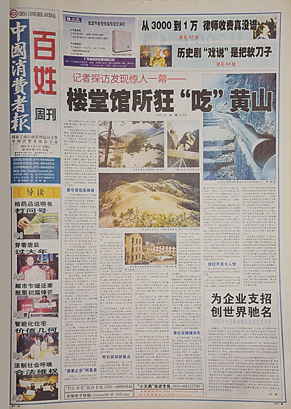 《中國(guó)消費(fèi)者報(bào)》記者在深入調(diào)查后,發(fā)表了《樓堂館所狂“吃”黃山》一文,將黃山的真實(shí)狀況公之于眾。當(dāng)時(shí)黃山市領(lǐng)導(dǎo)指責(zé)報(bào)道與事實(shí)不符,要求予以澄清,《中國(guó)消費(fèi)者報(bào)》拒絕。令人震驚的是,當(dāng)時(shí)建設(shè)部組成調(diào)查組對(duì)報(bào)道問題進(jìn)行調(diào)查,黃山市有關(guān)部門編造假規(guī)劃圖、謊報(bào)數(shù)字,導(dǎo)致調(diào)查組做出了一份內(nèi)容失實(shí)的《關(guān)于黃山問題的調(diào)查報(bào)告》,聲稱媒體報(bào)道與事實(shí)不符,黃山風(fēng)景區(qū)未遭破壞。