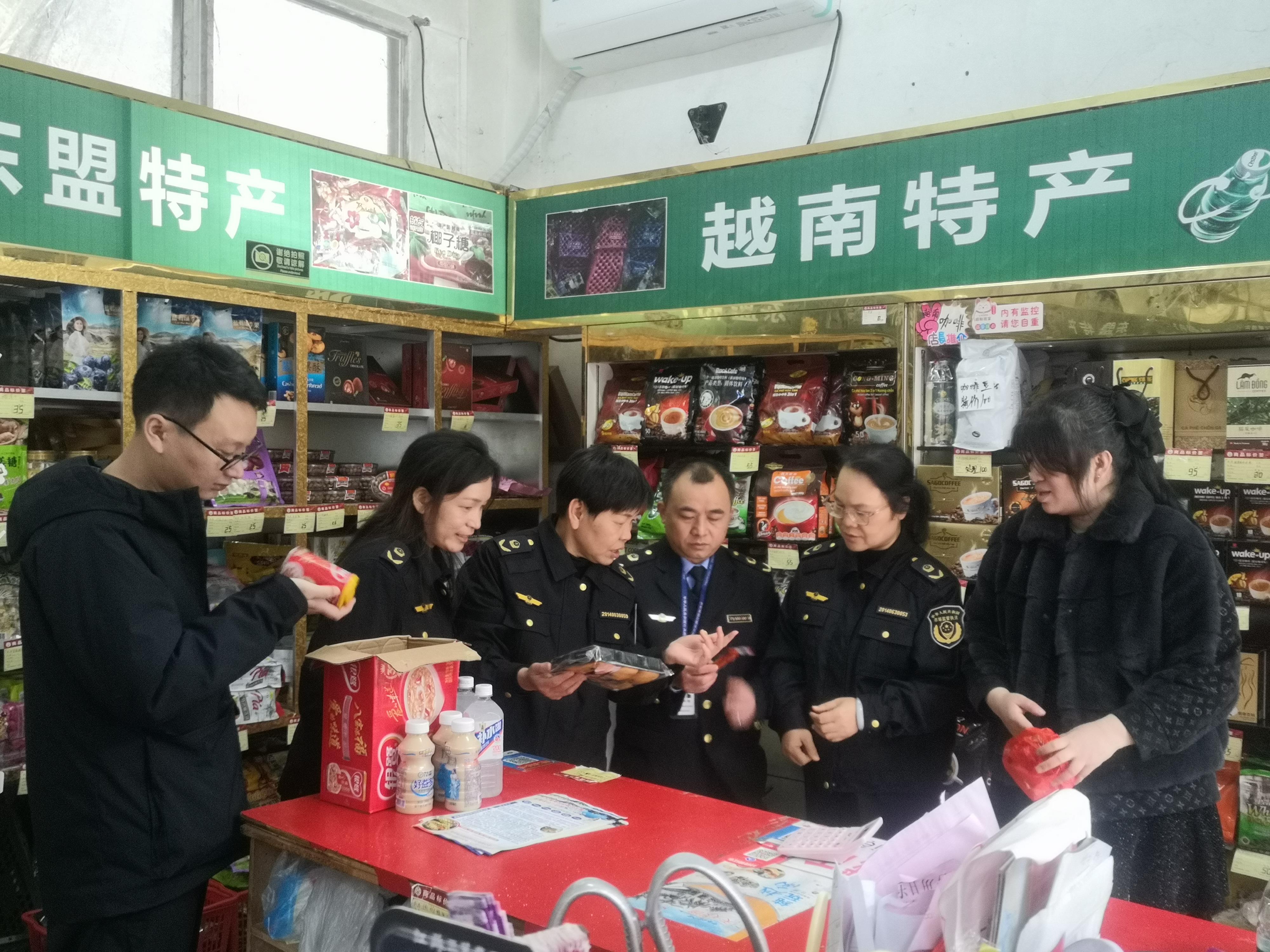 執(zhí)法人員到邊貿(mào)點(diǎn)開展食品藥品安全檢查。崇左市市場(chǎng)監(jiān)管局供圖