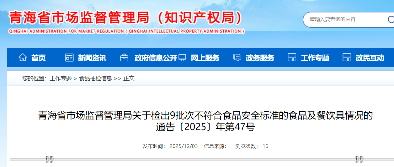 青海省市場監(jiān)管局在組織開展的食品安全監(jiān)督抽檢任務中,檢出9批次不符合食品安全標準的食品及餐飲具。對抽檢發(fā)現(xiàn)的不符合食品安全標準的食品,已組織屬地市場監(jiān)管部門完成核查處置,現(xiàn)將抽檢情況通告如下: