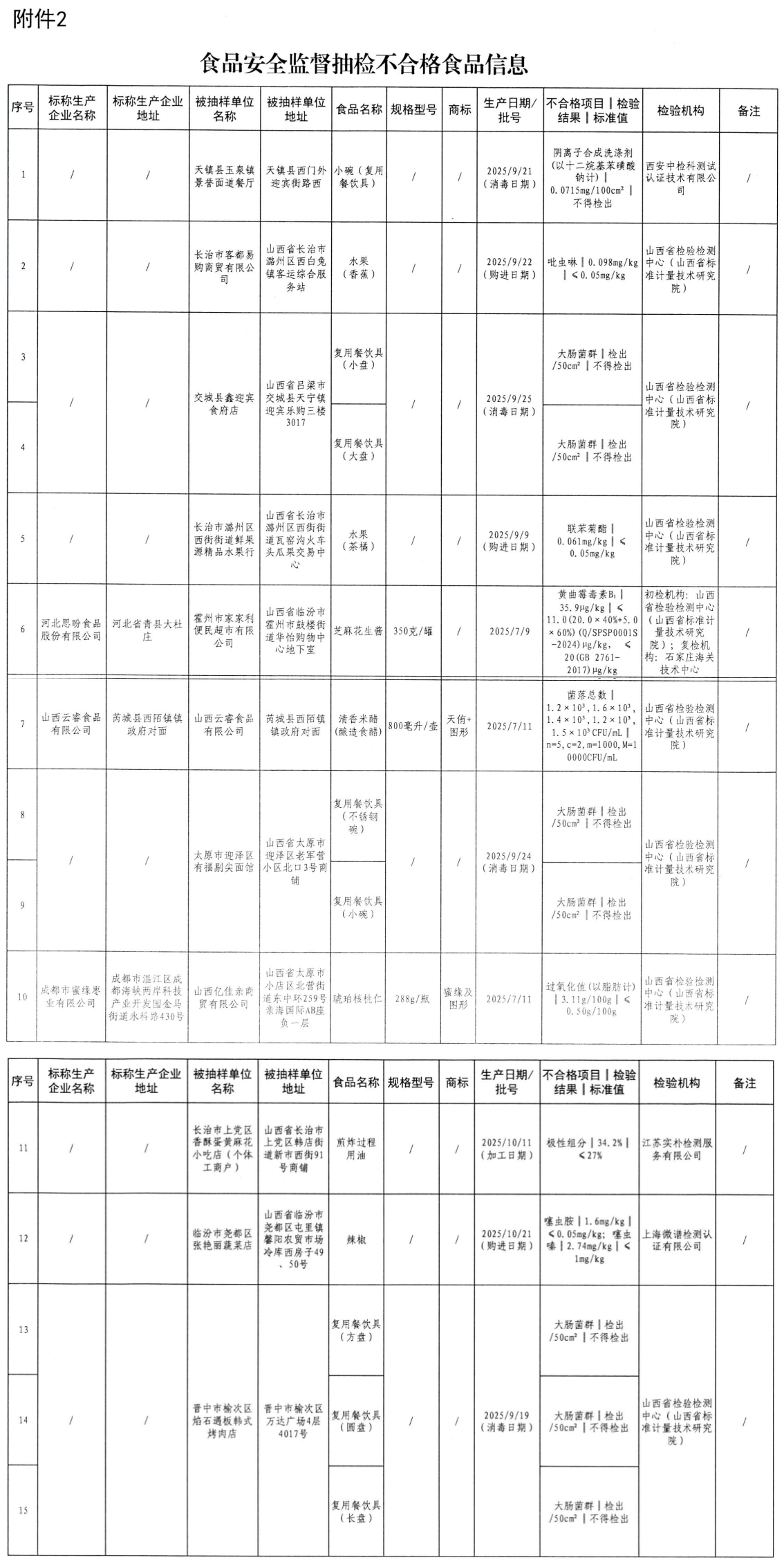 根據(jù)《中華人民共和國食品安全法》等法律法規(guī)要求及本省2025年度食品安全監(jiān)督抽檢工作實施方案和抽檢細(xì)則,山西省市場監(jiān)督管理局組織抽檢餐飲食品、豆制品、糕點、罐頭、酒類、糧食加工品、肉制品、食用農(nóng)產(chǎn)品、乳制品、方便食品、水果制品、保健食品、冷凍飲品、特殊膳食食品、薯類和膨化食品、水產(chǎn)制品、速凍食品、糖果制品、調(diào)味品、蔬菜制品、炒貨食品及堅果制品、淀粉及淀粉制品、嬰幼兒配方食品、飲料、茶葉及相關(guān)制品和食用油、油脂及其制品等26大類,共718批次。依據(jù)食品安全標(biāo)準(zhǔn)及國家有關(guān)規(guī)定進(jìn)行檢驗和判定,合格703批次,不合格15批次(抽檢信息詳見附件)。