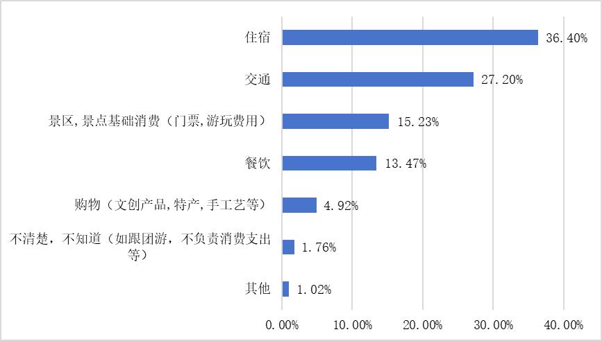 從支出情況看,“住宿”費(fèi)用支出較高的受訪者占比較高,占36.4%,其次是“交通”費(fèi)用支出,占27.2%。不過(guò),餐飲支出較多的受訪者僅占比13.47%,購(gòu)物支出較多的受訪者僅占比4.92%,占比均不高,通過(guò)各調(diào)查景區(qū)實(shí)地觀察發(fā)現(xiàn),部分景區(qū)未形成足夠的餐飲配套,影響游客消費(fèi)體驗(yàn)。相對(duì)于交通、住宿、基礎(chǔ)消費(fèi)而言,餐飲、購(gòu)物是重要增長(zhǎng)點(diǎn),有較大發(fā)展空間。